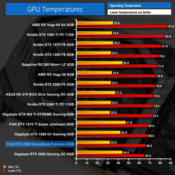 With a peak of 66C on the GPU core, this means the GameRock Premium is running just 1C hotter than the Gigabyte RTX 2080 Gaming OC. This is still a fantastic result and makes it 9C cooler than the Founders card. It is also worth bearing in mind the Palit card does have a clock speed advantage over the Gigabyte card as well – but the Palit's cooling setup can still produce excellent results.