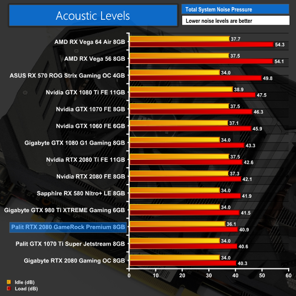 The GameRock Premium is a very quiet card, coming in just marginally louder than the Gigabyte RTX 2080 Gaming OC. In the real world, you would be hard pressed to tell the two apart – both are fantastically quiet.
