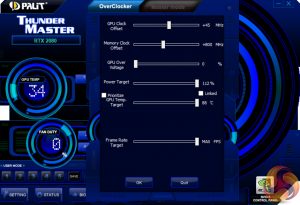 When overclocking the GameRock Premium, we used Thunder Master – Palit's GPU overclocking utility. We maximised the power limit and temperature target sliders before adding +45MHz to the GPU core and +800MHz to the memory.
