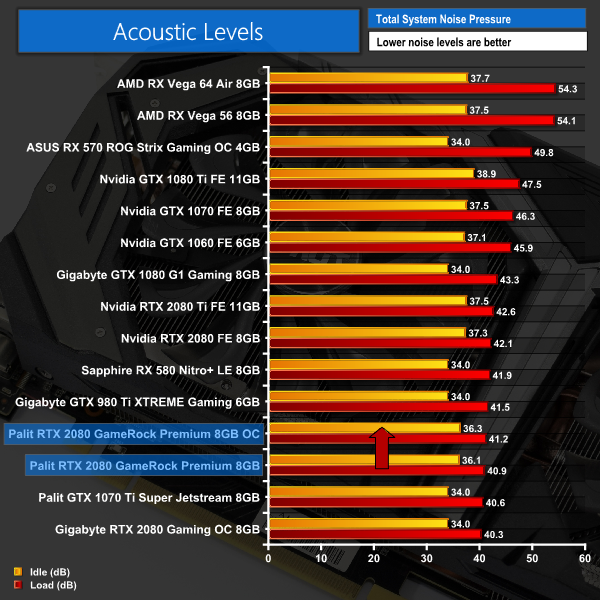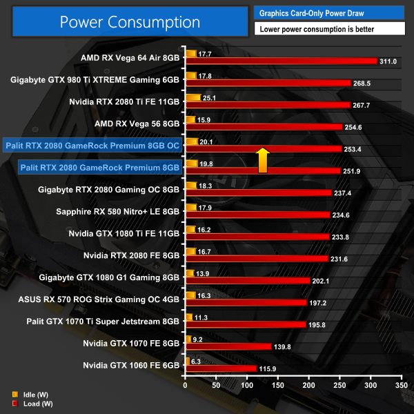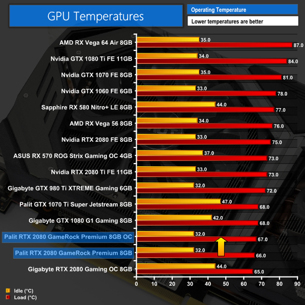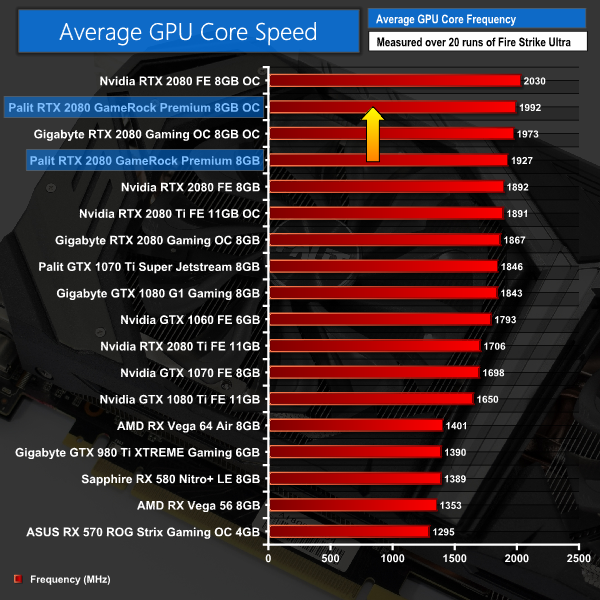 In terms of clock speed, the Palit averaged a frequency of 1992MHz – 65MHz faster than its stock speed. This is still slower than what our Founders card hit when overclocked, but it is a better result than the Gigabyte RTX 2080 Gaming OC.