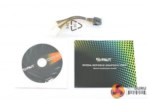 Inside, the included accessories consist of a driver disk, a quick start guide and one 2x 6-pin to 1x 8-pin adapter cable.