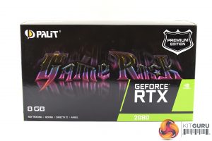 The Palit RTX 2080 GameRock Premium ships in a glossy black box, with the multi-colour GameRock branding taking up almost the entire front of the box. There's also a sticker in the top right-hand corner signifying this is the ‘Premium' edition, which has a 60MHz clock speed advantage over the regular GameRock card.