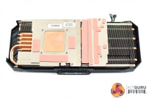 In terms of the cooler, this utilises 5 heatpipes which look like they are each 8mm in diameter. The GPU contacts with a copper core, while there are an additional two coldplates – one for the VRAM chips and one for the VRM. There are also all the necessary thermal pads where we would expect to see them.