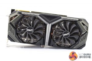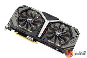 Getting a look at the card itself, we can see Palit has opted for a dual-fan configuration, with each fan measuring 95mm in diameter. These are a translucent grey in colour and that matches with the overall look of the shroud – it is a combination of dark grey, black and metallic silver. The grey sections on the far left and right of the shroud are made from metal, but most of it is made from plastic.