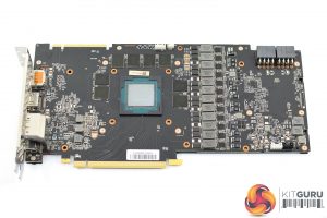 Getting a look at the PCB only requires the user to remove 8 screws from the back of the card. We can see that Palit has made some fairly significant changes to the PCB design when compared to reference – foremost among these being the move to a 10+2 power phase design, instead of the 8+2 power delivery found on the Founders card. The GameRock Premium also requires 2x 8-pin power connectors as we will see below.