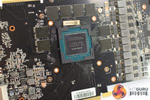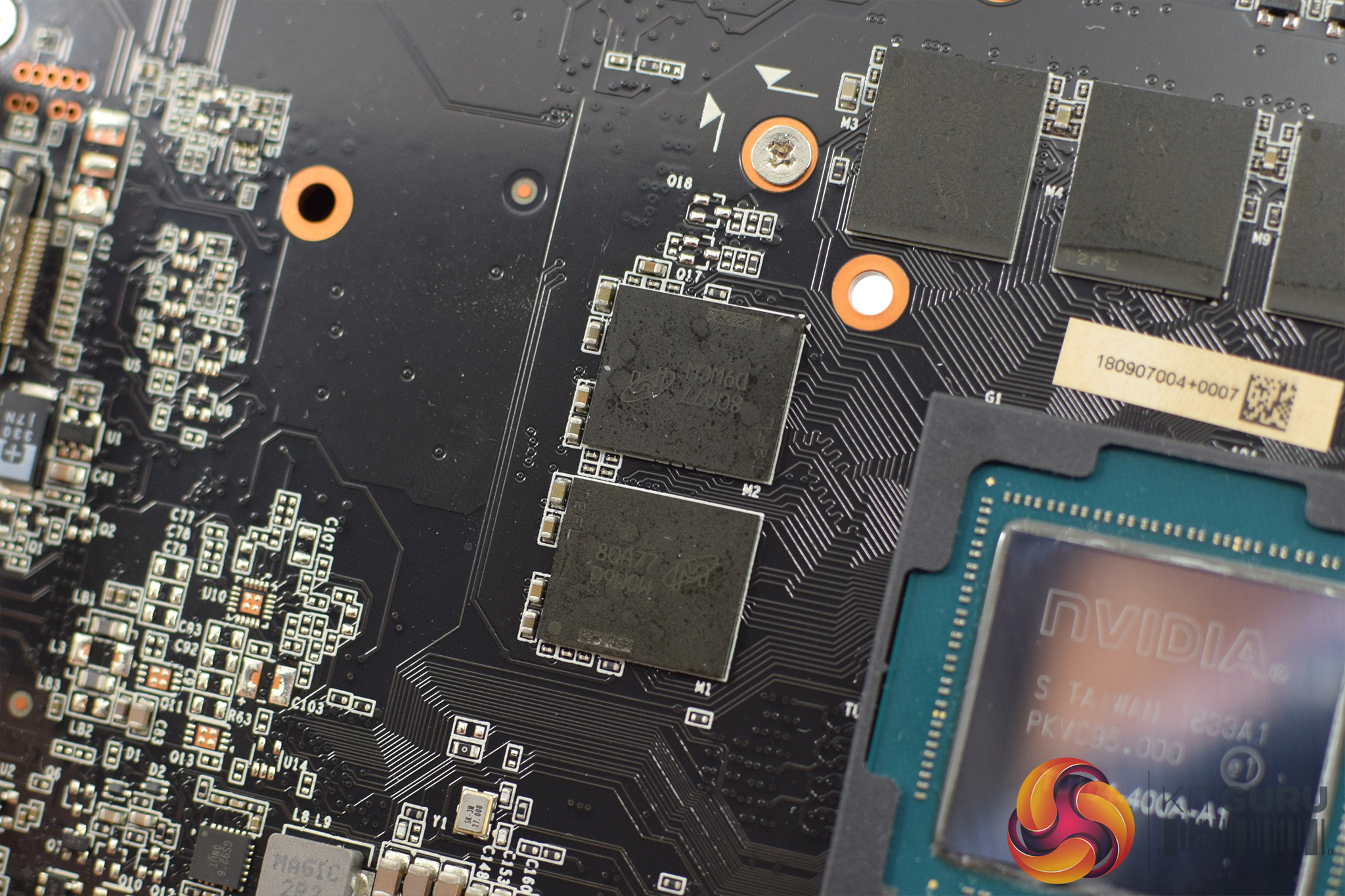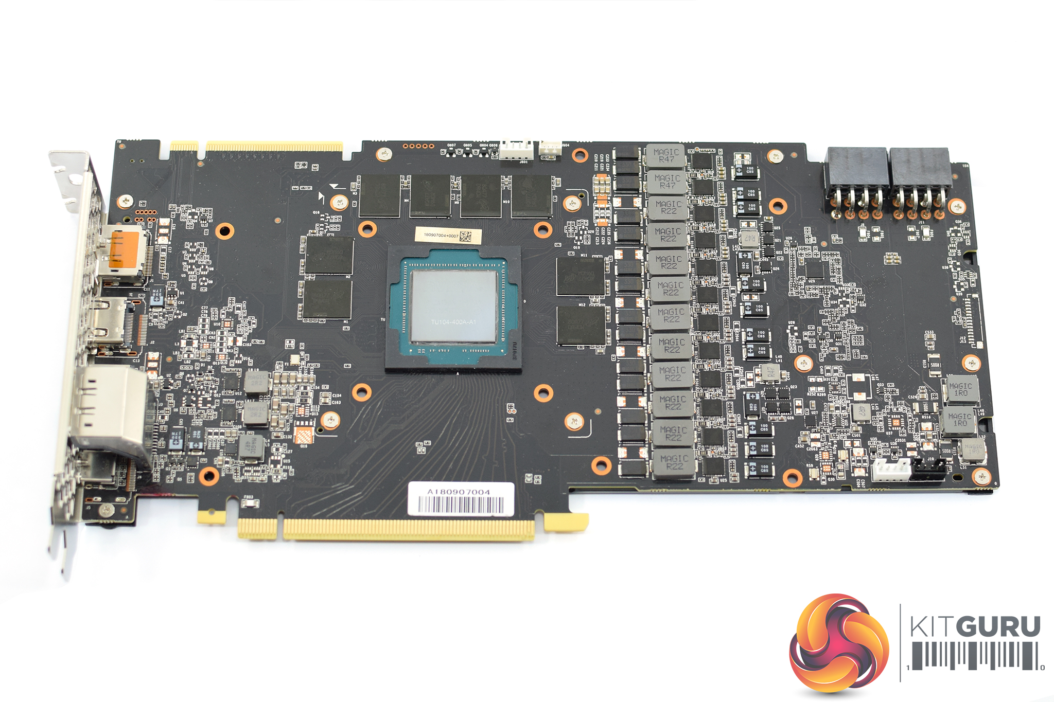 Elsewhere, the 8 GDDR6 memory chips are manufactured by Micron, with the model number 8QA77D9WCW. The GPU die is also labelled TU104-400A – with the ‘A' meaning that this is a binned chip suitable for a factory overclock. Non-A chips have to be sold by Nvidia's partners at reference speeds.