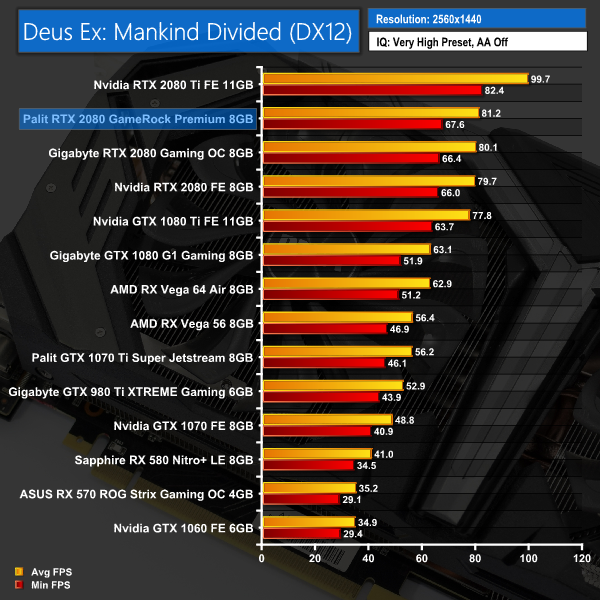 Our first game – Deus Ex: Mankind Divided – shows the Palit card enjoying a lead of between 1-2FPS when compared with the Gigabyte RTX 2080 Gaming OC.