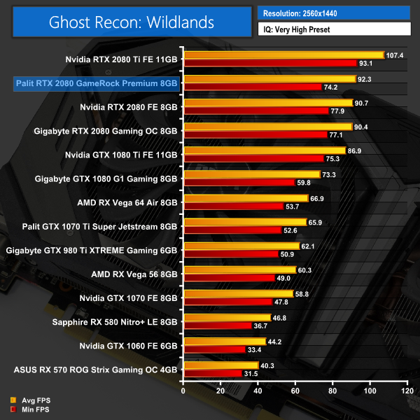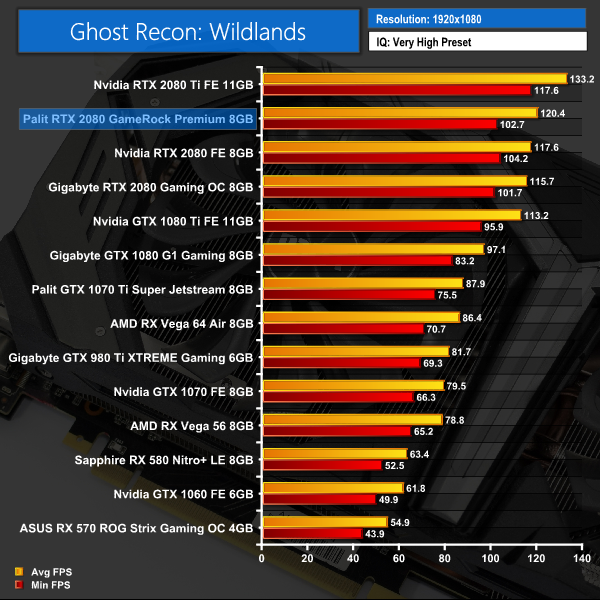 Ghost Recon Wildlands continues this trend – the Palit is 0.8 FPS faster at 4K than Nvidia's Founders Edition RTX 2080, while Gigabyte's RTX 2080 is only 0.2FPS behind that.
