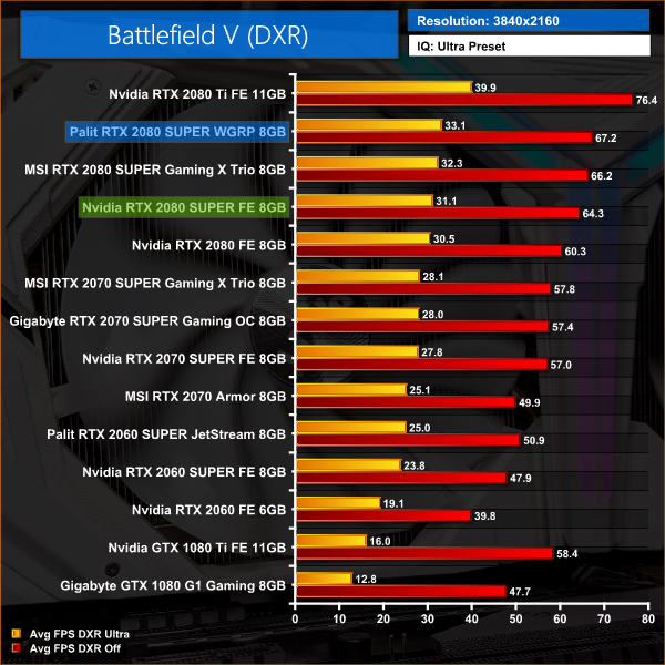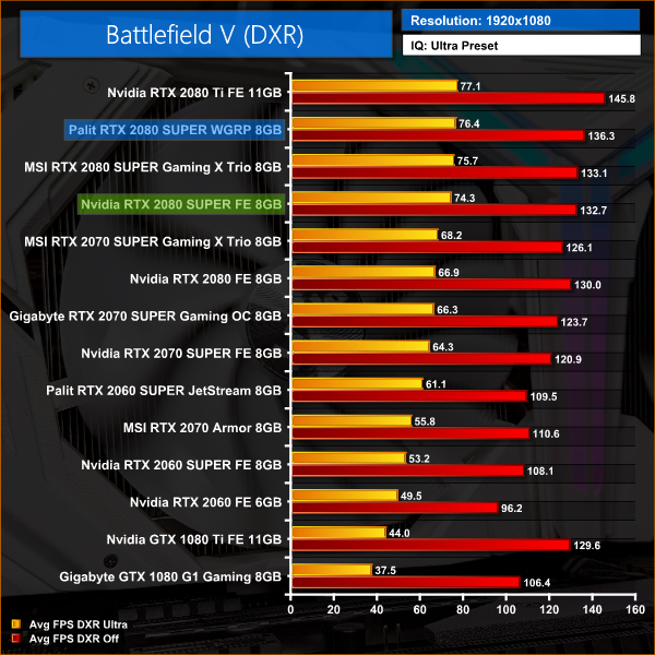 We test using the Ultra preset with the DX12 API. Battlefield V was the first game released with Nvidia RTX ray tracing features (called DXR in game) and we present average frame rates for the game with DXR Off, and then again with DXR set to Ultra.