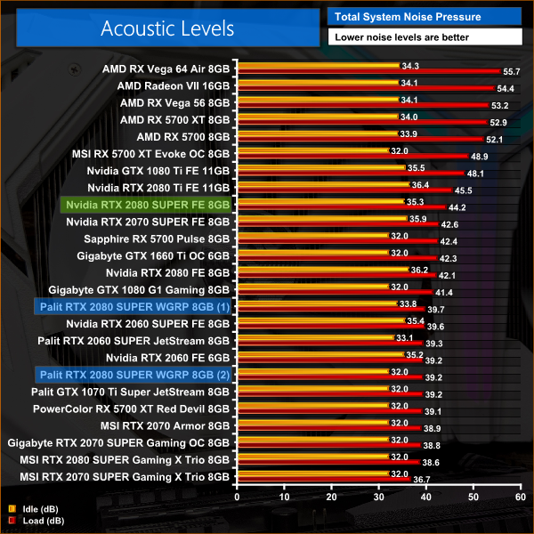 We take our noise measurements with the sound meter positioned 1 foot from the graphics card. I measured the noise floor to be 32 dBA, thus anything above this level can be attributed to the graphics cards. The power supply is passive for the entire power output range we tested all graphics cards in, while all CPU and system fans were disabled.