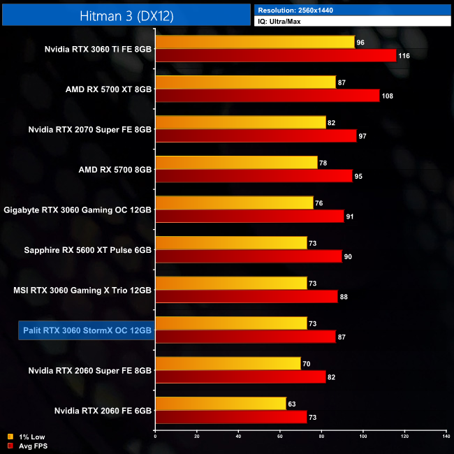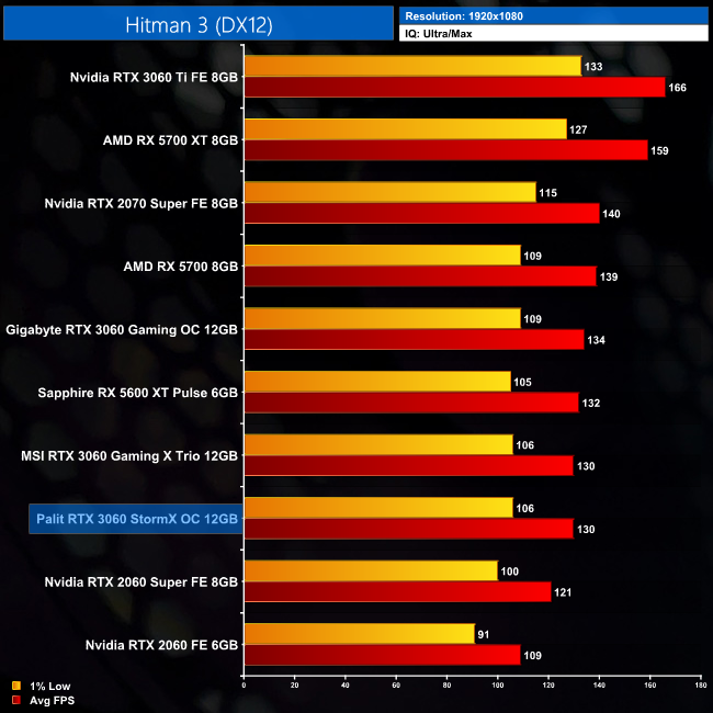 The newest game in our test suite is Hitman 3, which sees the StormX again doing very well at 1080p, averaging 130FPS. Compared to the RTX 2060, it's 19% faster here, and it's also on par with the RTX 3060 Gaming X Trio.
