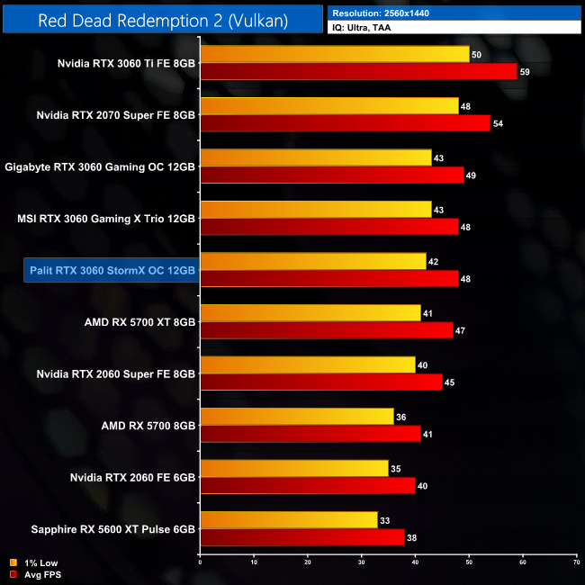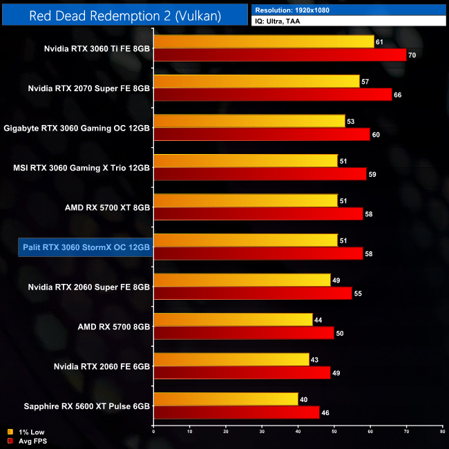 Red Dead Redemption 2 is one of the most demanding games we test, and at 1080p the StormX OC couldn't quite average 60FPS using Ultra settings. It's just 1FPS behind the RTX 3060 Gaming X Trio, however.
