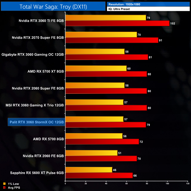 The latest Total War title sees the Palit StormX OC averaged just under 80FPS, so it's effectively on par with the Gaming X Trio. Relative gains compared to the RTX 2060 are more limited however, at just 13%.