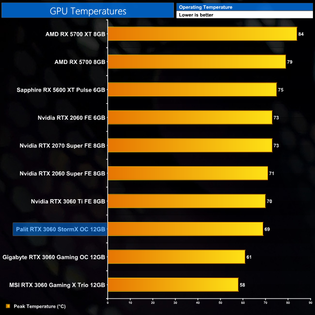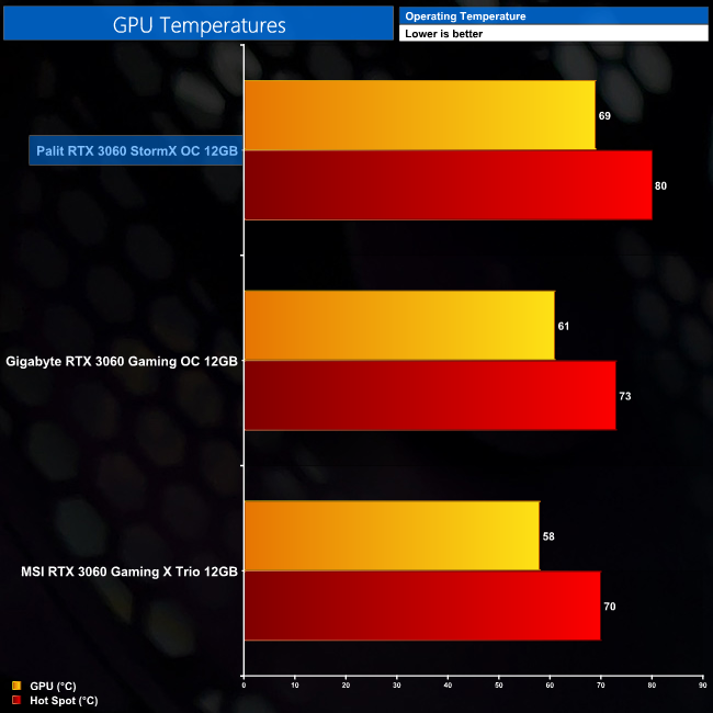 As for thermals, the StormX OC runs surprisingly cool. I thought it would run hotter, certainly into the high 70s, but out of the box the GPU peaked at just 69C, while the hot spot hit 80C. Yes, this does make it the hottest-running RTX 3060 we've tested, but it's also by far the smallest, and either way, 69C is still a great result.