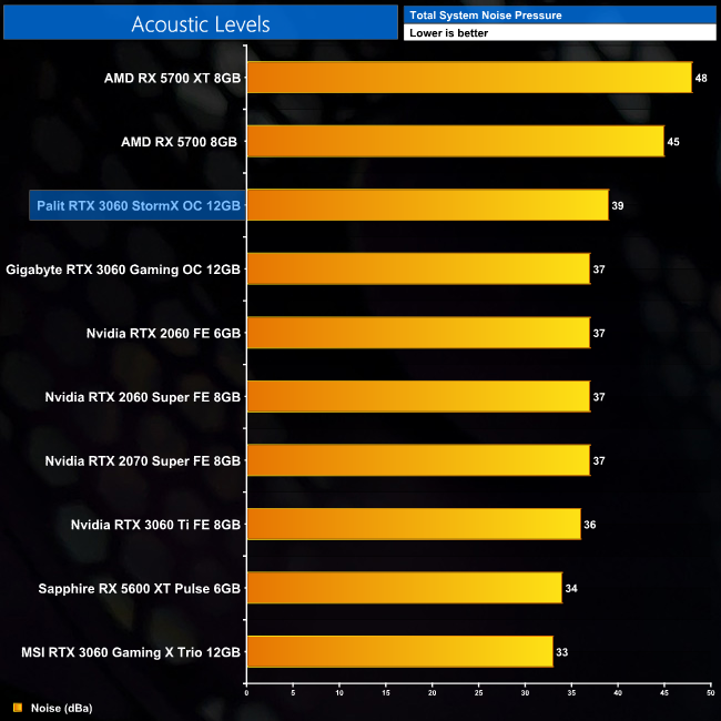 Default fan behaviour for the single 100mm on the StormX OC sees it spins up to 54%, or 1570rpm, with a noise reading of 39dBa. This certainly isn't nearly as loud as something like the RX 5700, but it was just about audible over our system's case fans while gaming. I still wouldn't class it as a loud card, but is is audible.