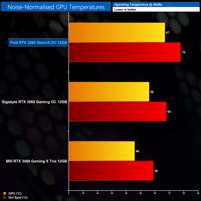 Following on from our stock thermal and acoustic testing, here we re-test the operating temperature of the GPU, but with noise levels normalised to 40dBa. This allows us to measure the efficiency of the overall cooling solution as varying noise levels as a result of more aggressive fan curves are no longer a factor.