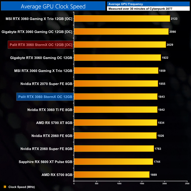 Still, the lack of any power headroom means the StormX OC can't quite sustain clock speeds at the same level as the Gaming X Trio or Gaming OC. It did average over 2000MHz though, so that's still a 10% boost compared to its out of the box behaviour.