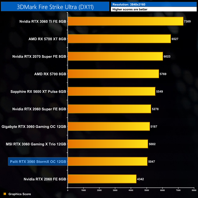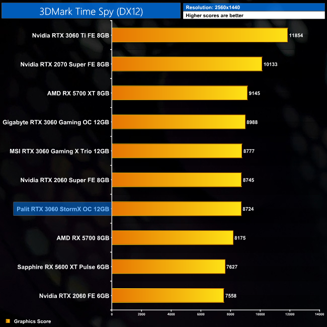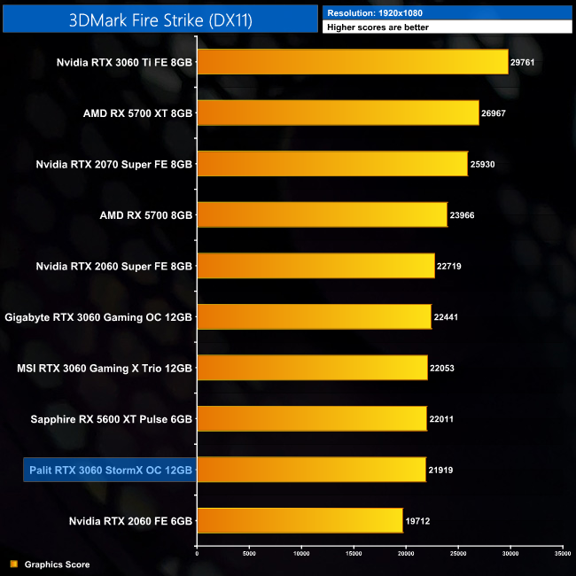 Kicking off with our 3DMark benchmarks, here we can see the Palit scores the lowest of the three RTX 3060s we have tested so far. It's hardly a big difference, but it's 2-3% behind the Gigabyte Gaming OC model we reviewed for launch day.