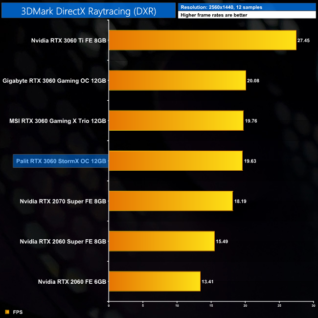 In terms of the DXR featuretest, the StormX OC averages just below 20FPS, putting it 2% behind the Gigabyte Gaming OC.