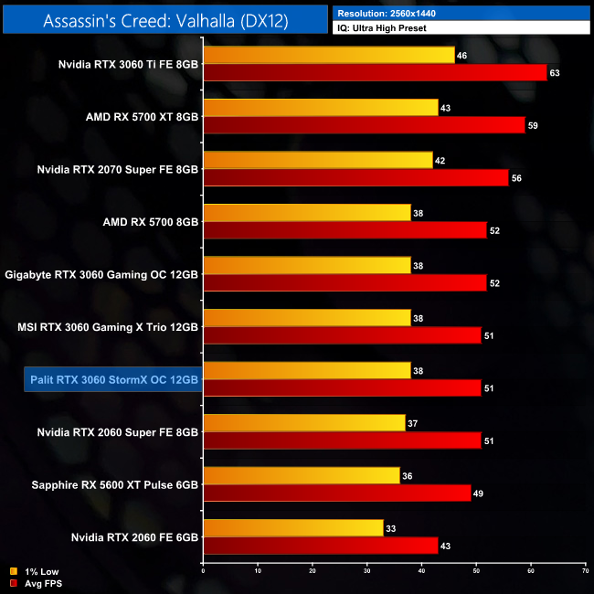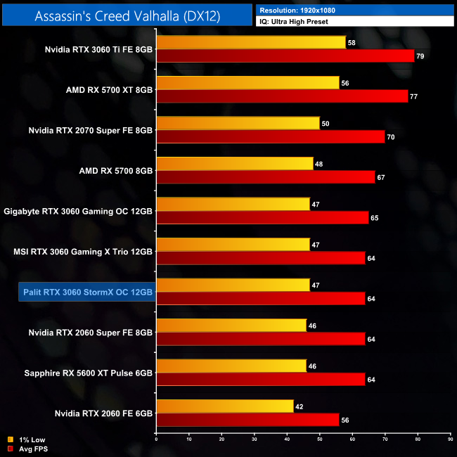 Starting our game benchmarks with Assassin's Creed Valhalla, here all three RTX 3060s we've tested perform within 1FPS of each other. For the StormX OC, we're looking at a 14% performance uplift compared to the RTX 2060.