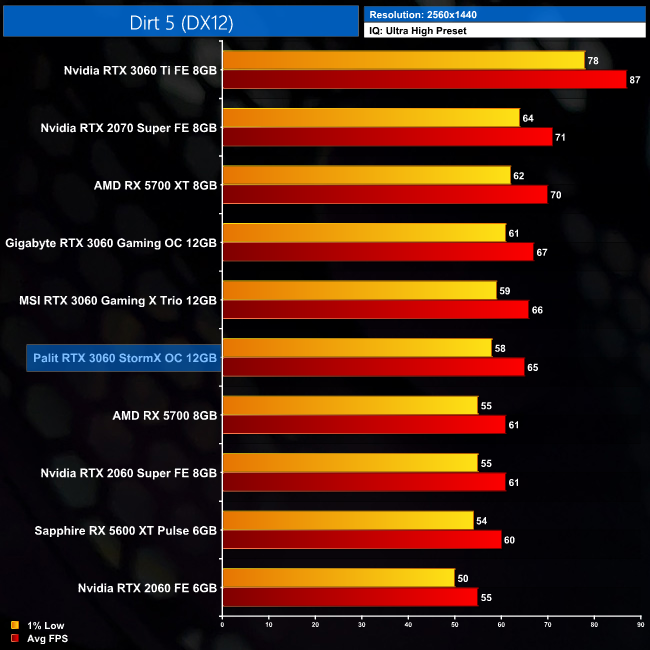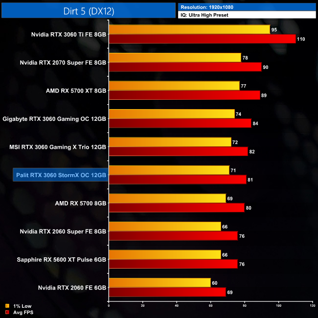 As for Dirt 5, here the StormX OC comes in 9% slower than the RX 5700 XT at 1080p, while it's also the slowest of three RTX 3060. MSI's Gaming X Trio is only 1% faster though, and that is significantly bigger and more expensive.