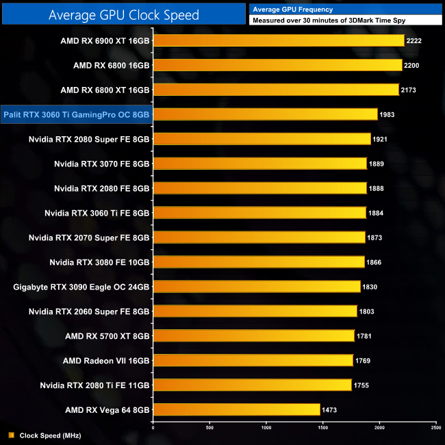 As we have alluded to throughout the review, the GamingPro OC is able to outperform the Founders Edition thanks to its higher operating clock speed. Over the duration of our 30-minute stress test, the GPU averaged 1983MHz, which is almost 100MHz faster than the Founders Edition.