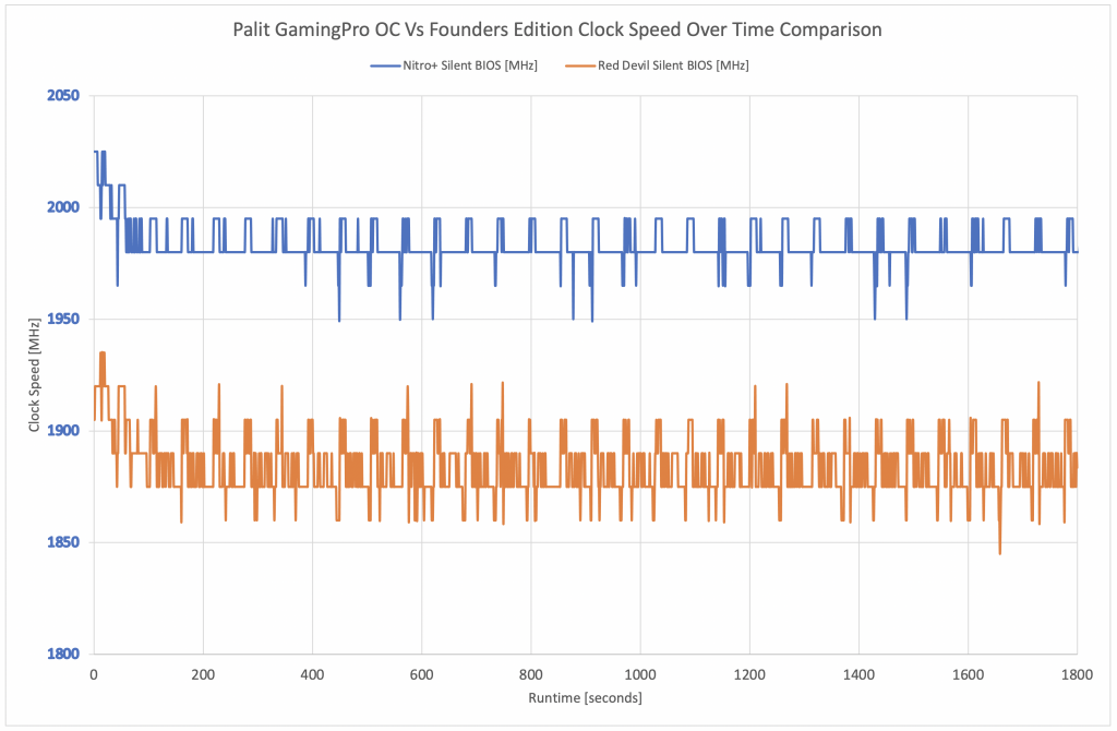 Following on from our look at average GPU clock speed, here we present a series of charts, comparing the frequency response of the GamingPro OC and the RTX 3060 Ti Founders Edition.