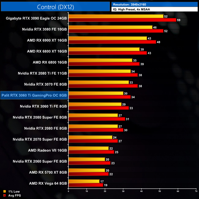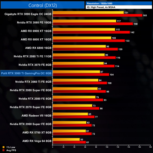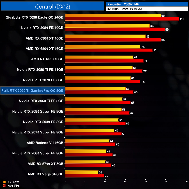 Looking at our first game of the day, Remedy's Control, the GamingPro OC is able to use its higher clock speed to outperform the Founders Edition by 5% at 1440p. Bear in mind though, that's a difference of just 3FPS.