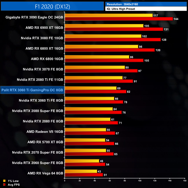Next up is F1 2020, and this game sees the GamingPro OC average 142FPS at 1440p resolution. This is a lead of 5FPS compared to the Founders Edition, or another 4% difference in Palit's favour.