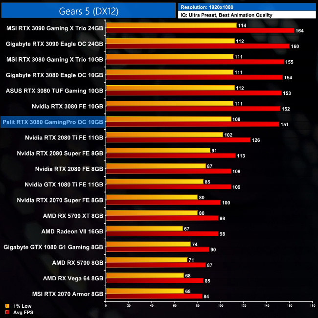 It's more of the same in Gears 5. The Palit GamingPro OC is 1% slower than the Founders Edition at every resolution we tested, but that means it is still 32% faster than the RTX 2080 Ti at 4K.
