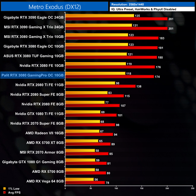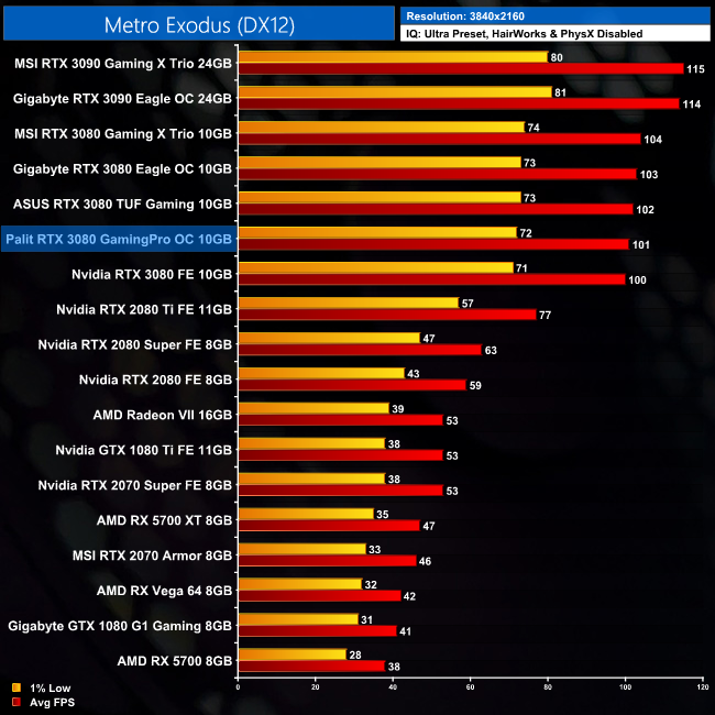The Palit RTX 3080 GamingPro OC also edges out the Founders Edition by a single frame in Metro Exodus, when tested at 4K. That puts it 31% ahead of the RTX 2080 Ti.