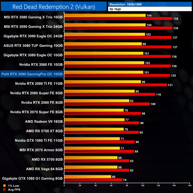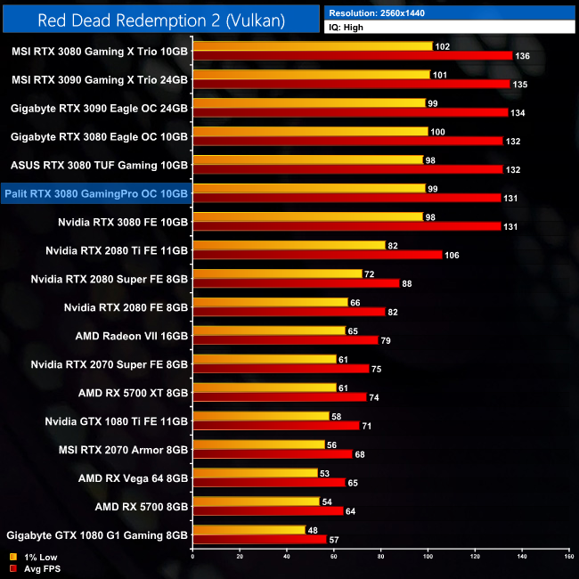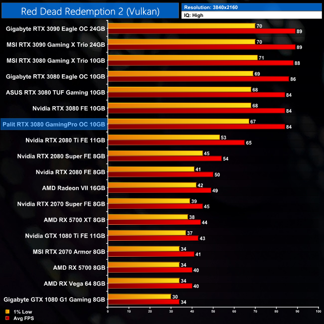 As for Red Dead Redemption 2, here the GamingPro OC is matching the performance of the Founders Edition, producing 84FPS on average at 4K.