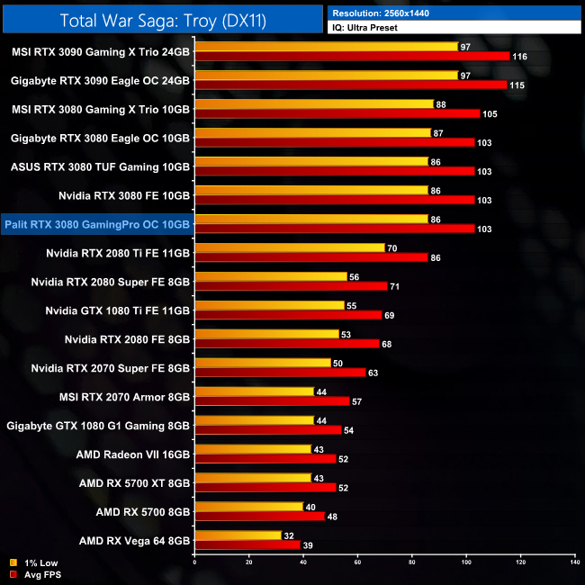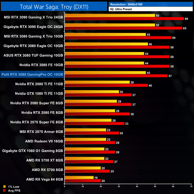 Our final game of the day is Total War Saga: Troy, and this is pretty typical of our testing today – the GamingPro OC is just a single frame slower than the RTX 3080 Founders Edition at 4K.