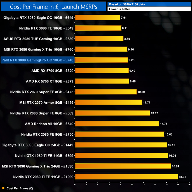 Calculating the cost per frame, using the £739.99 SSRP given to use by Palit, shows this to be the overall worst value RTX 3080 that we have tested so far. Of course, that is based on manufacturer-provided pricing, and the other partner cards listed in the chart are simply not available at those prices at the time of writing. Even then, this RTX 3080 is still better value than anything out there for 4K gaming right now.