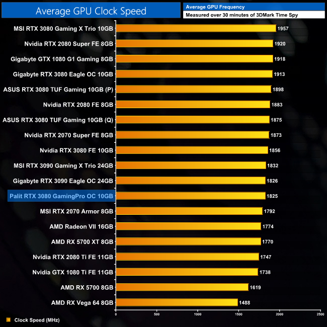 Despite having a rated boost clock of 1740MHz, which is 30MHz above stock clocks, in the real world the card averaged 1825MHz, which is about 30MHz slower than the Founders Edition. We can see in our second scatter graph, where we compare the clock speed behaviour over 30 minutes for both the Palit and Nvidia Founders Edition, that the Nvidia card is consistently running at higher speeds.