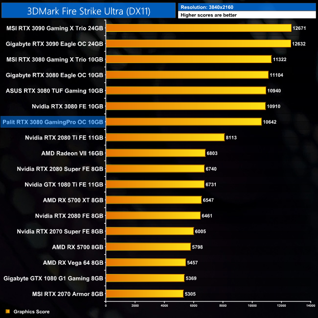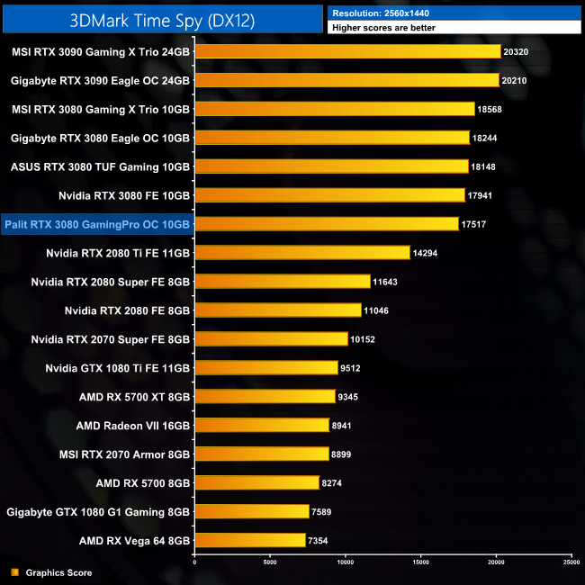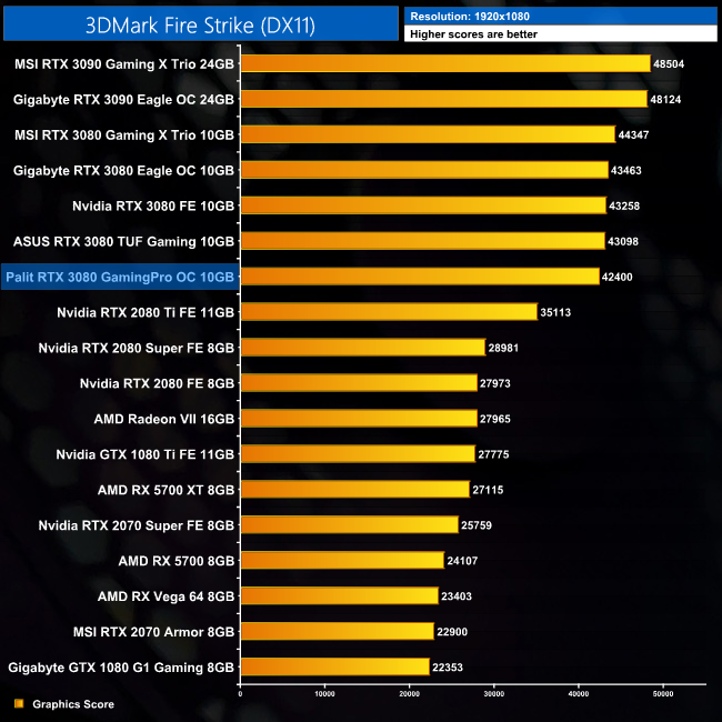 Kicking off our performance testing with 3DMark, these initial results see the GamingPro OC performing marginally worse than the RTX 3080 Founders Edition, with scores coming in about 2% lower.