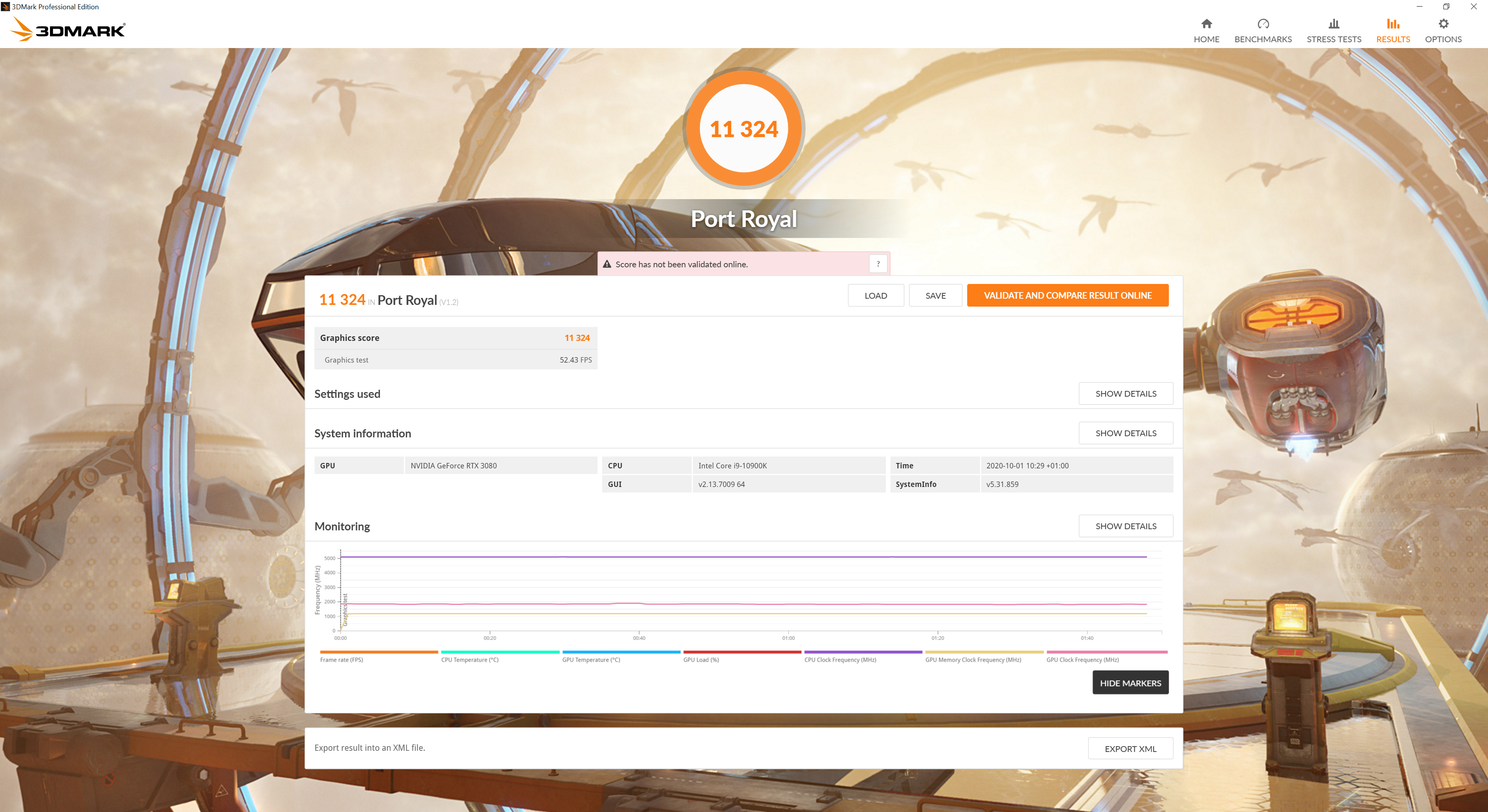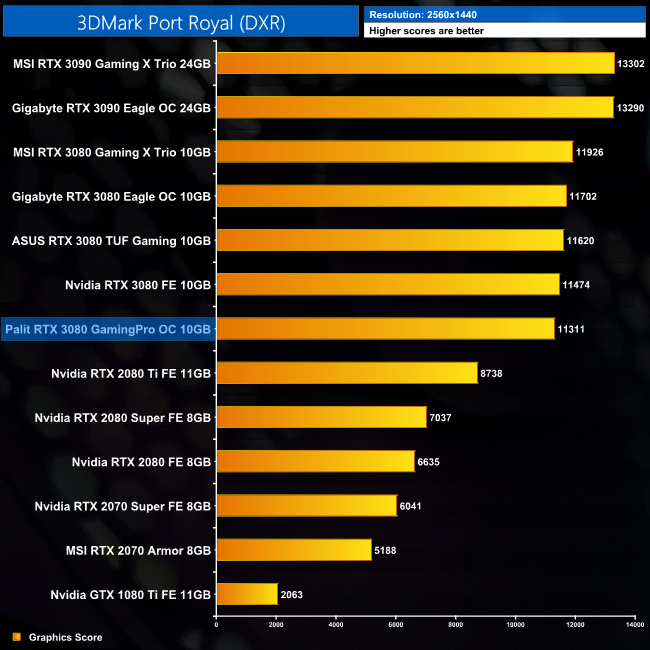 Port Royal, 3DMark's ray tracing benchmark, sees the GamingPro OC come in just 1% behind the Founders Edition.