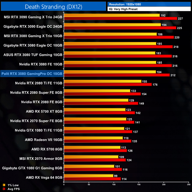 Death Stranding sees the RTX 3080 GamingPro OC average 100FPS at 4K, just 1FPS behind the Founders Edition. This puts the Palit GPU 33% ahead of the RTX 2080 Ti.