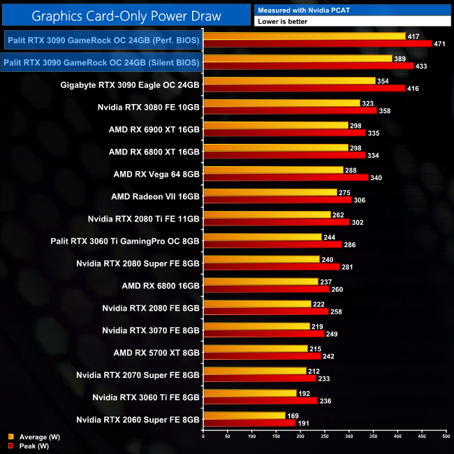 Then looking at graphics card-only power draw, we can see both modes are pretty close to their rated TGPs – the Performance BIOS averaged 417W, with a 420W target, while the Silent BIOS averaged 389W, with a 390W target.