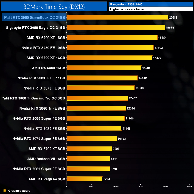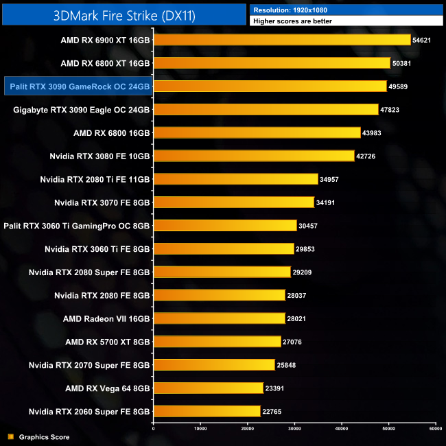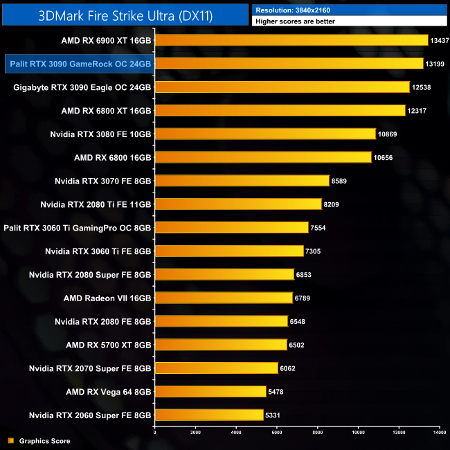 Starting off with 3DMark, we can see the GameRock OC offers a reasonable amount of extra performance when compared to Gigabyte's RTX 3090 Eagle OC. In Fire Strike and Time Spy, for instance, the Palit GPU is 4% faster, but that increases to 5% in Fire Strike Ultra. In that test, there's only a 2% difference between the GameRock OC and AMD's 6900 XT.