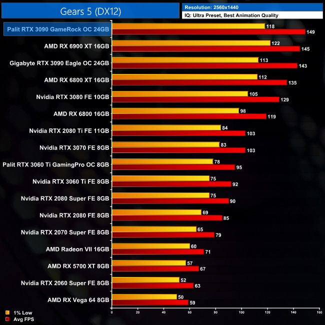Gears 5 shows more of an improvement for the GameRock OC, as it once more delivered an extra 4% boost to frame rates, when compared to the RTX 3090 Eagle OC. It is also 8% faster than the RX 6900 XT.
