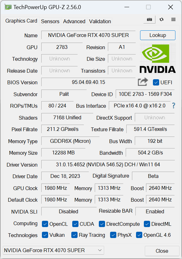 TSMC's N4 node has Nvidia cranking up the clock speed significantly this generation, with the reference RTX 4070 Super sporting the same 2475MHz rated boost clock as the original model. Palit has bumped this up a fair amount with the JetStream OC however, with a rated boost clock of 2640MHz.
