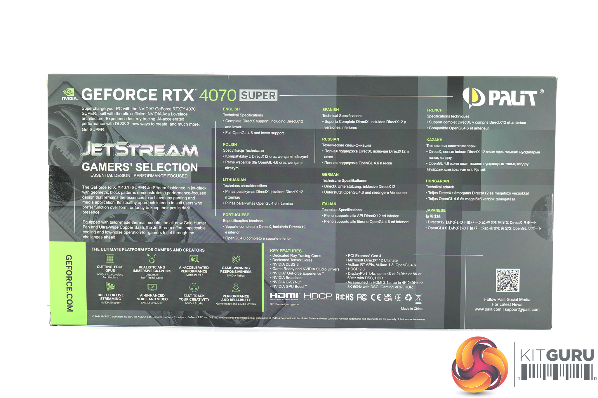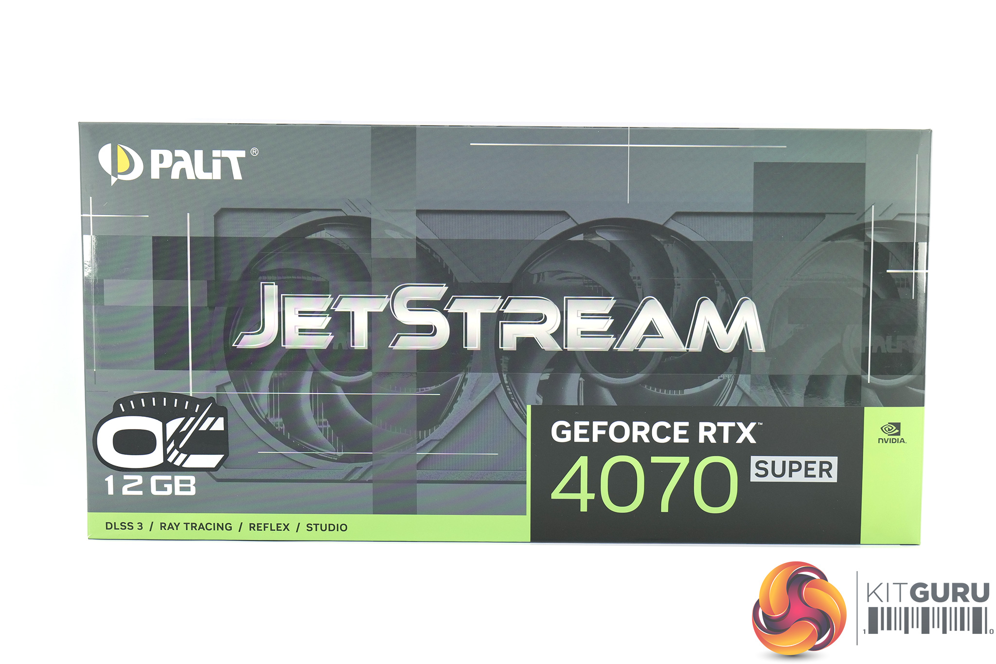 Palit's RTX 4070 Super JetStream OC ships in a grey box, with a desaturated image of the graphics card visible underneath the large JetStream logo. On the back, key features of the card are highlighted in multi-lingual text.
