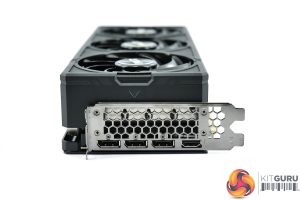 Power is supplied by a single 12VHPWR/PCIe Gen5 power connector, though a dual 8-pin adapter is included in the box. Display outputs are standard, with 3x DisplayPort 1.4 and 1x HDMI 2.1 connectors.