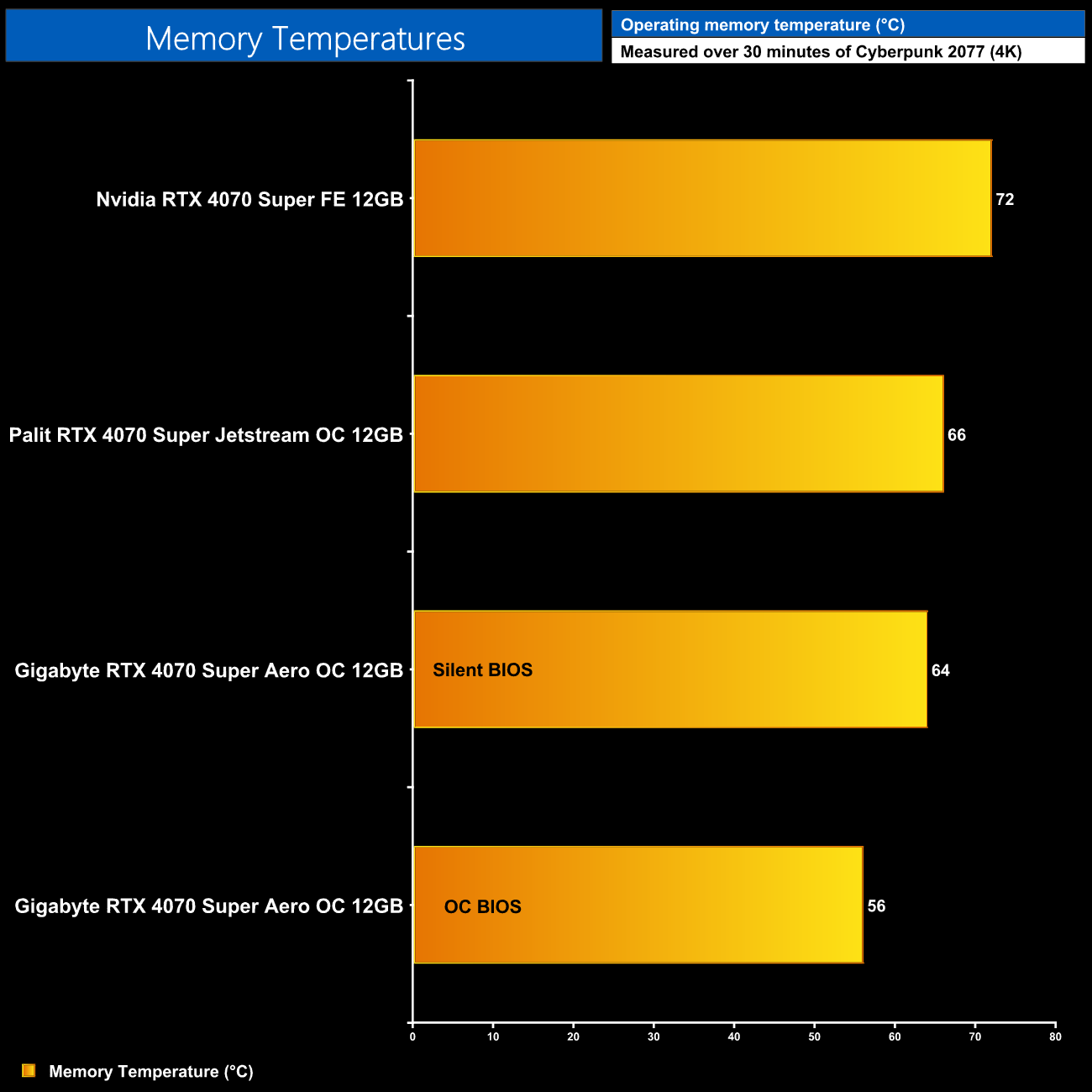 For our memory temperature testing, we measure the peak memory temperature under load. A reading under load comes from running Cyberpunk 2077 for 30 minutes.