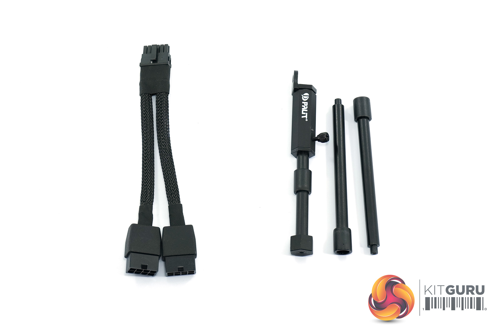 Inside, we find a dual 8-pin power adapter, an ARGB cable used to synchronise the card's RGB lighting with your motherboard, and a height-adjustable GPU support bracket which screws into the side of the card to prevent GPU sag.