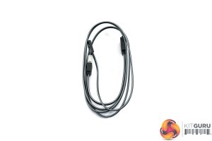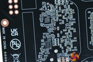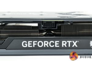 We can also note the 12VHPWR power connector, with the RGB header positioned right next to this connector which lets you sync the lighting with your motherboard via the included cable. I do like this inclusion but the placement of the RGB header potentially causes a cable management headache, so I would have preferred to see this header on the end of the card.
