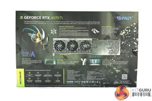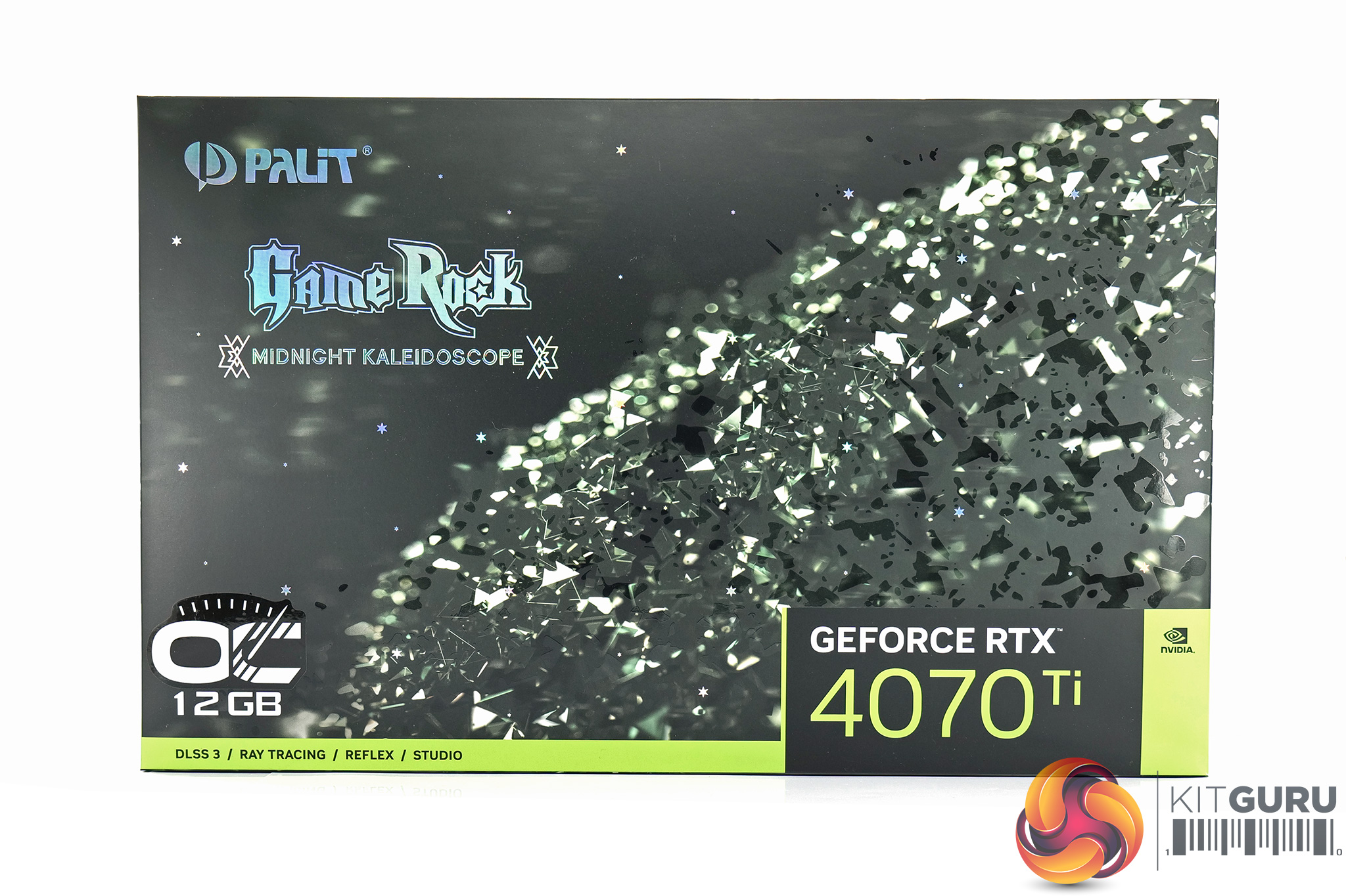The Palit RTX 4070 Ti GameRock OC ships in a dark box, with an eye-catching crystal-like pattern on the front. On the back, Palit highlights a few key features of the card and the cooler design.