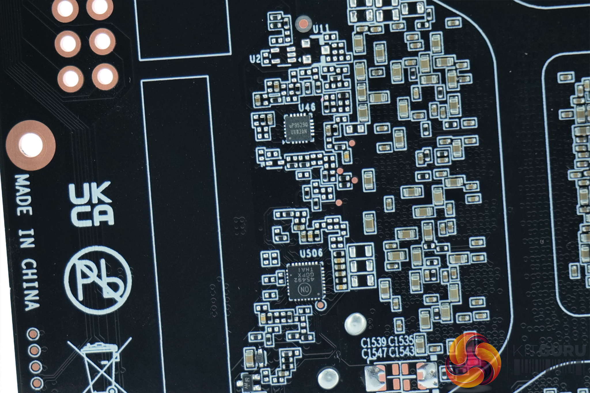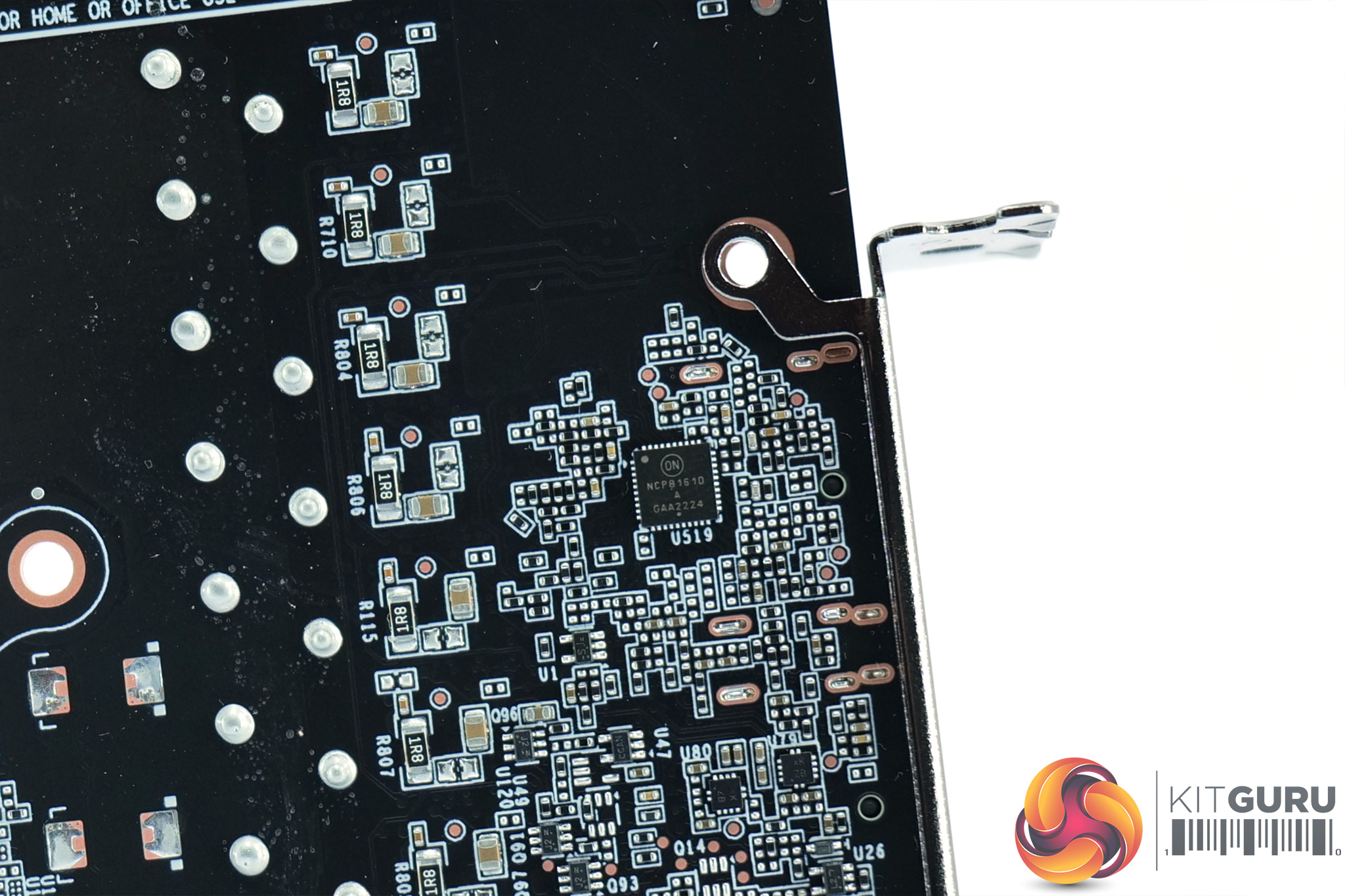 The PCB is really the biggest area of difference between the 4080 and 4070 Ti GameRock OC models. For one, Palit is using a very small PCB, sporting a 12-phase VRM for the GPU and a 2-phase design for the memory. OnSemi NCP302150 MOSFETs are used across the board, rated for 50A. Palit is also using OnSemi's NCP81610 controller for the GPU VRM, and a UPI uP9529Q controller to handle the memory.