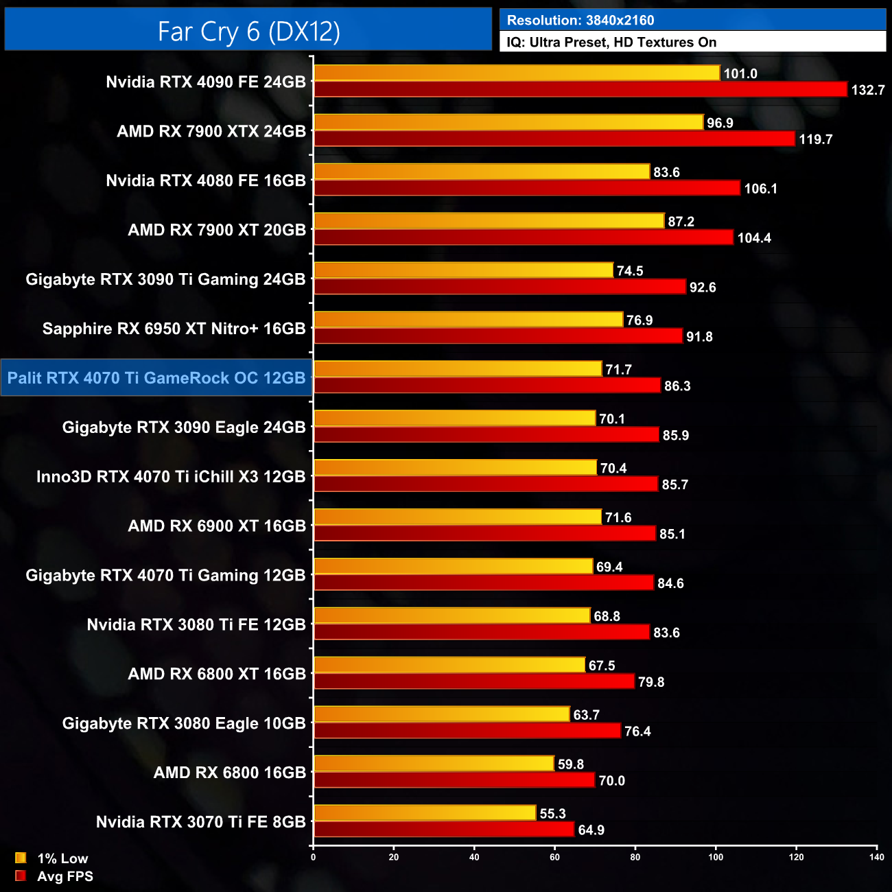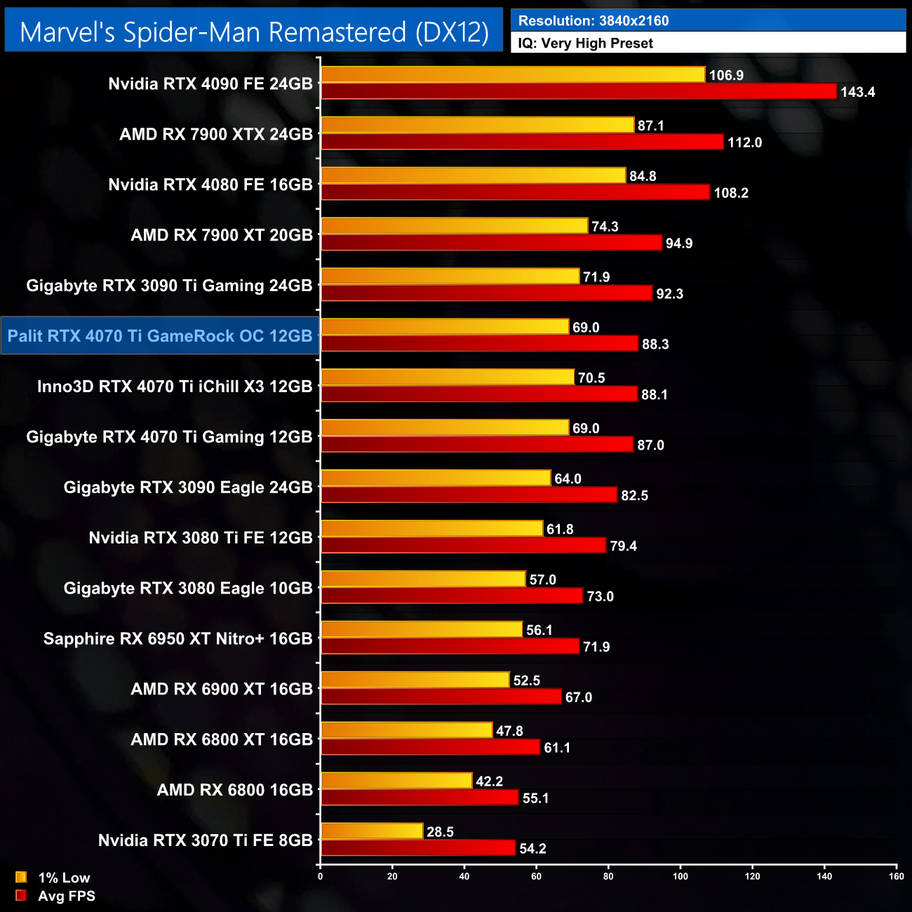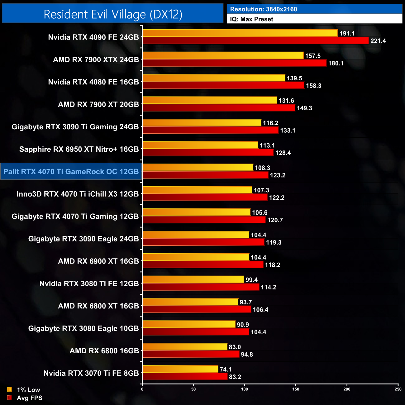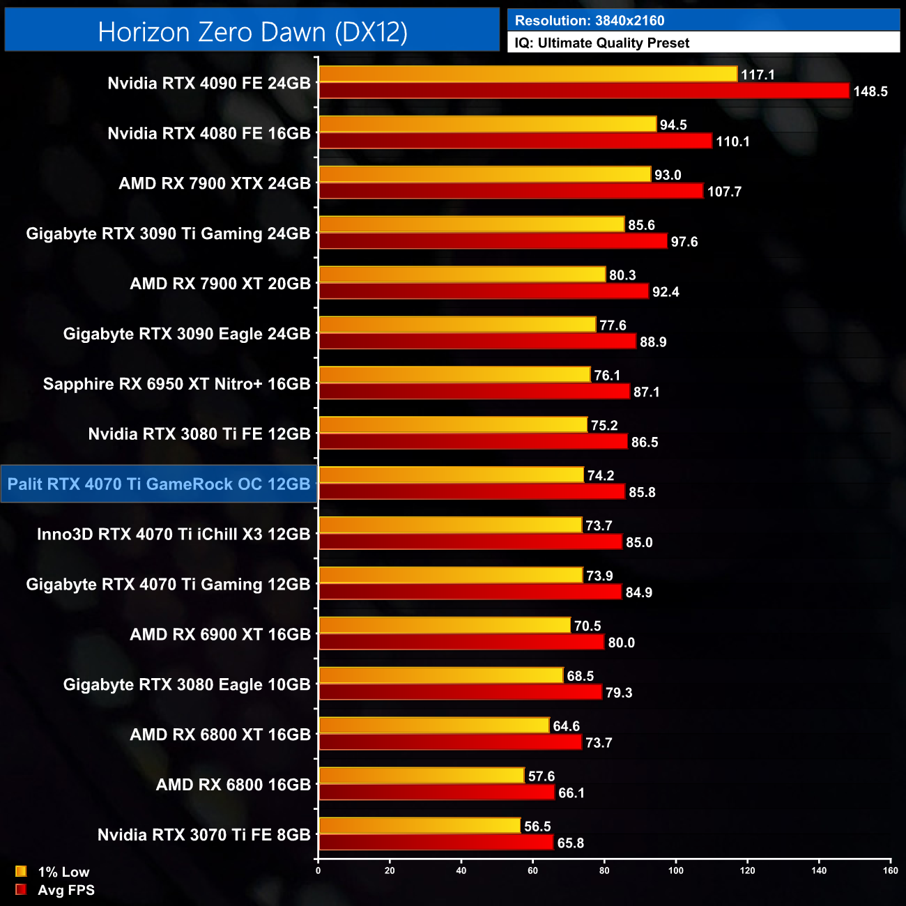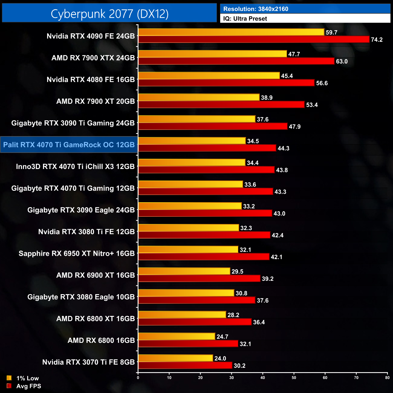 Over the five games we tested, the GameRock OC did technically prove to be the fastest 4070 Ti yet, but only by the absolute tiniest of margins. In fact, it was never more than 2% faster than the Gigabyte Gaming OC, so realistically you wouldn't be able to tell the difference between the two. It will still offer very solid frame rates at 1440p or 4K, but don't expect any significant gains due to the factory overclock.